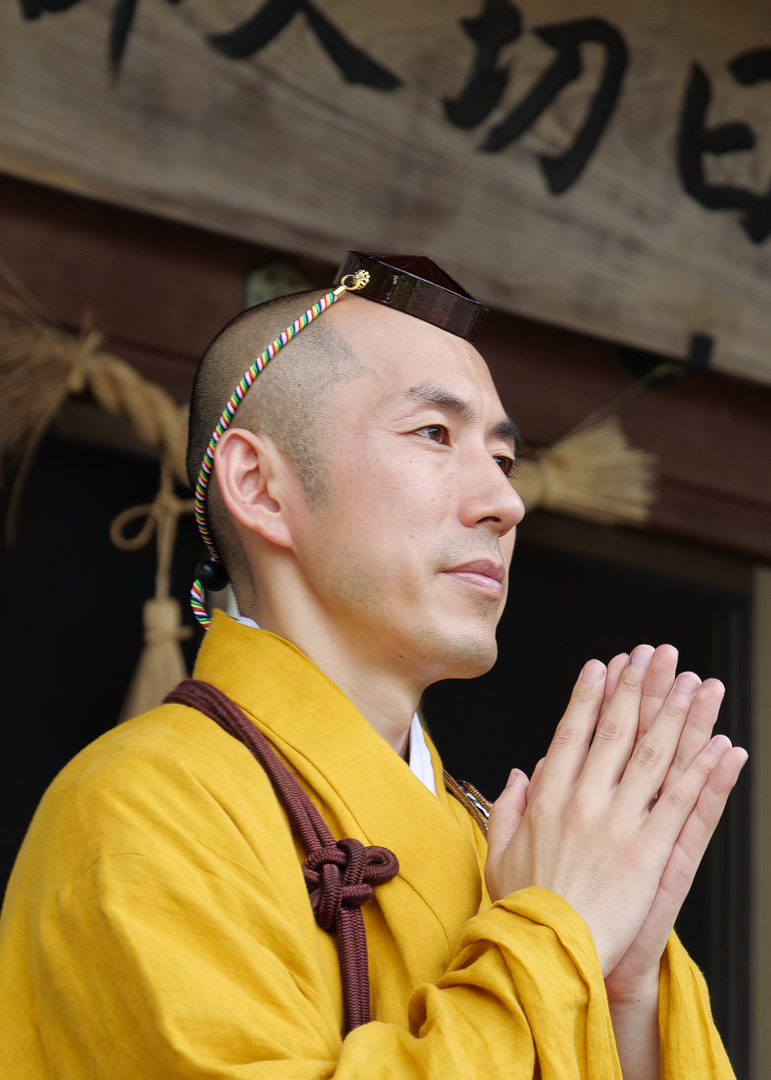 「山人犬の会」顧問。石鎚山真言宗総本山・極楽寺教学部長。仁和寺より賜りし弘法大師御像をご本尊に、世の苦しみと向き合う相談・祈祷の寺として崇敬を集める弘元寺副住職。幼少より石鎚山に入峯。泉涌寺・醍醐寺での修行の後も、焼八千枚護摩供をはじめ数々の荒行を成満。六根を清浄にして山に入り、森羅万象を如来の説法と受けとめることを宗として、石鎚山・瓶ヶ森や龍王山への登拝修行や滝修行を定期的に厳修している。修行を通して「己の身を委ねる」体験を積み重ね、神佛・自然・先達より習いながら心の寛容さを養い、「相互礼拝・相互供養」ひいては「相互繁栄」の道を共に歩んでいくべく、広く修行者に向け門戸を開いて、国内外より集う多くの行者を導いている。